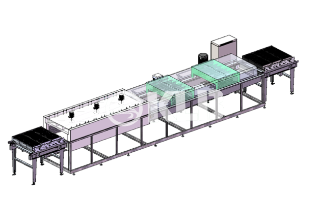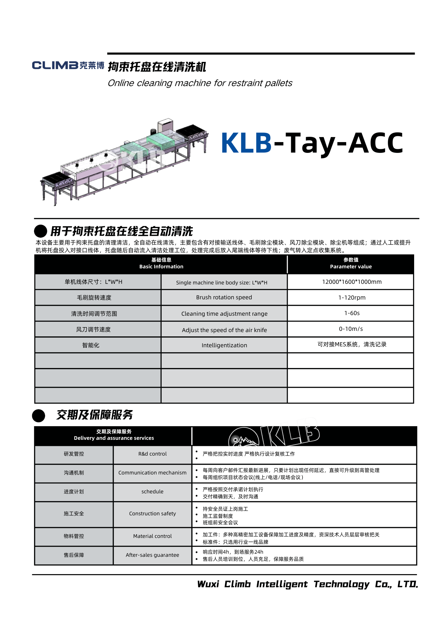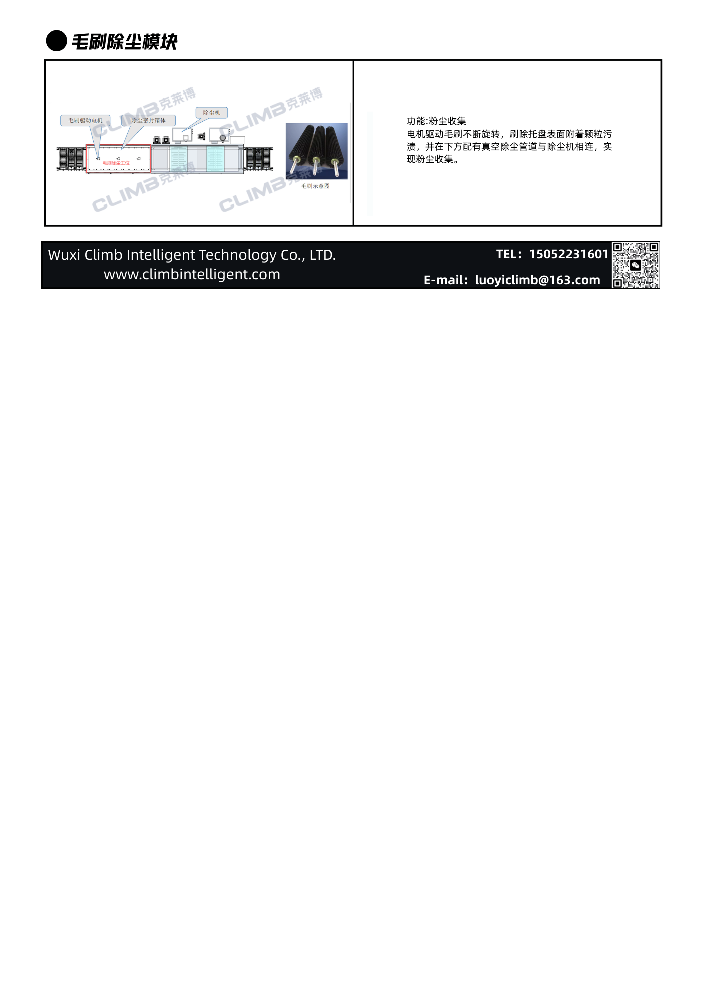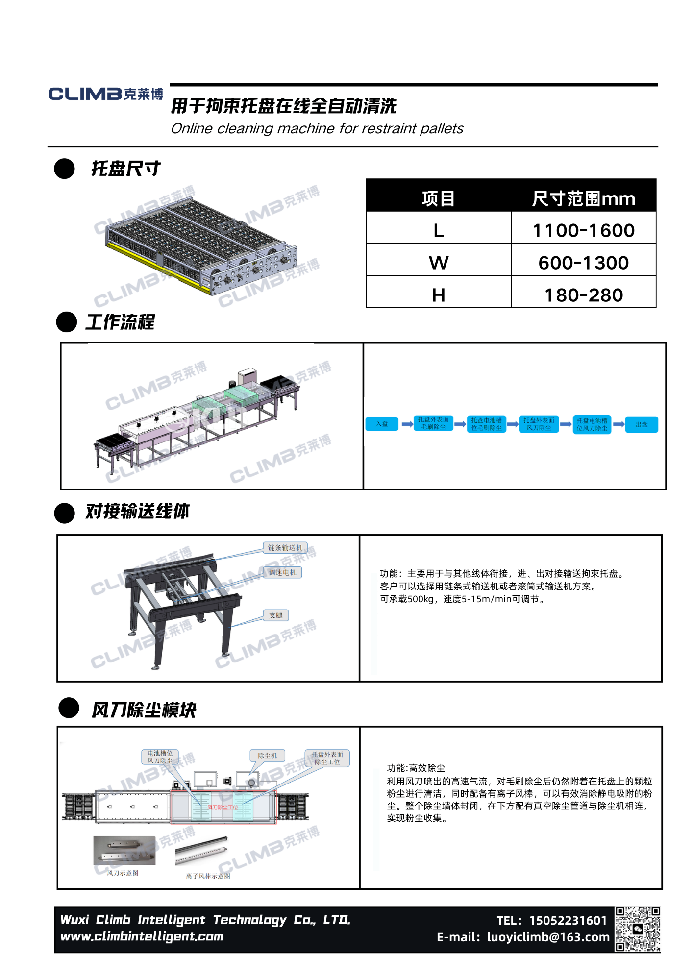 本设备用于拘束托盘在线全自动清洗,主要包含有对接输送线体、毛刷除尘模块、风刀除尘模块、除尘机等组成。